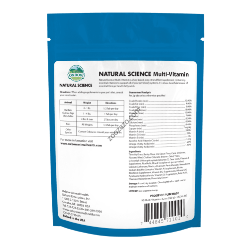 Високо съдържание на фибри, ежедневна подкрепа за вашия най-добър приятел! Natural Science Multi-Vitamin е добавка на основата на сено, богата на фибри, съдържаща основни витамини за подпомагане на всички телесни системи на вашия домашен любимец. Тя е и полезен източник на есенциални Омега 3 и 6 мастни киселини.