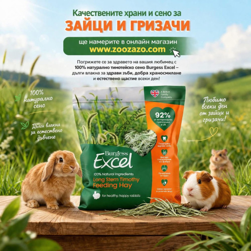 Burgess Excel Long Stebel Feeding Hay е сено от Тимотей, окосено в точното време и изсушено в рамките на 48 часа. Дългите стъбла на сеното задоволяват както дъвченето за здравето на зъбите, така и естественото търсене на храна, давайки на зайците емоционалното обогатяване, от което се нуждаят.