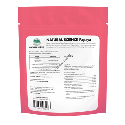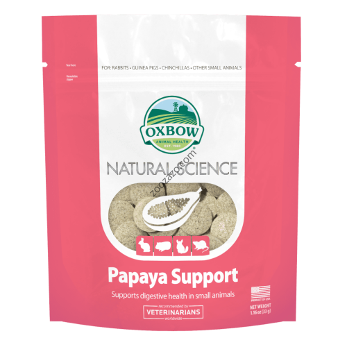 Поддръжката на папая за естествени науки на Oxbow е предназначена да поддържа здравето на храносмилателната система на вашия домашен любимец. Премиум съставките включват папая и ананас (естествени източници на активните ензими, папаин и бромелаин) и високо съдържание на фибри тимотейно сено.